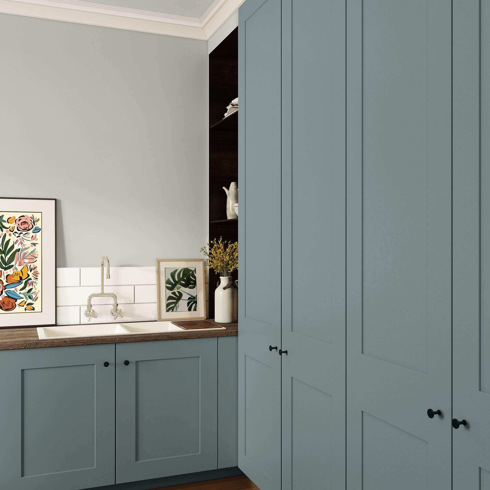 Salbeigrün habe ich jetzt eher heller vor Augen, die Küche meines Sohnes wird dunkler, das ist ein graustichiges dunkleres Grün. Das geht farblich mehr in diese Richtung.